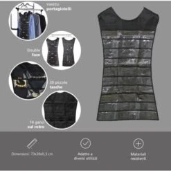 Double face: 30 piccole tasche trasparenti davanti e 14 ganci indietro