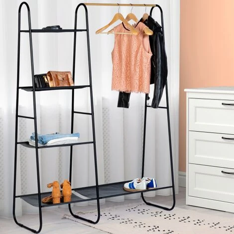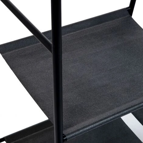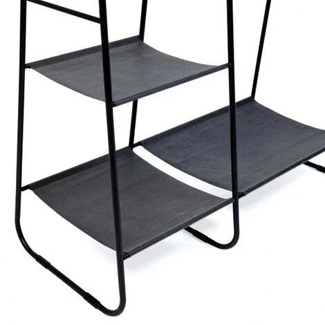Questo appendiabiti nero/metallo è al tempo stesso trendy e funzionale: ha un’ampia barra appendiabiti che può contenere grucce lunghe fino a 63 cm. Le due estremità dello scaffale terranno i vestiti in posizione. Grazie alle sue grandi dimensioni di 155 cm, potrete riporre tutti i tipi di abiti, sia lunghi che corti. In questo modo si evita che i vestiti si rovinino o si sgualciscano. Vi piacerà il suo aspetto multifunzionale con i suoi 5 ripiani in tessuto nero 100% poliestere, dove potrete riporre vestiti, cesti, scatole o scarpe nella parte inferiore. Sistemate lì la scatola del lucido da scarpe, ad esempio, e sarete sempre impeccabili quando uscirete di casa!Il design sobrio e puro dell’appendiabiti PATSY lo rende adattabile: si inserisce in qualsiasi stanza della casa. Sarà molto utile in una lavanderia per riporre cappotti e accessori, ma diventerà presto indispensabile anche in una camera da letto per organizzare il guardaroba.Sarà molto utile in una lavanderia per riporre cappotti e accessori, ma diventerà essenziale anche in una camera da letto per organizzare il guardaroba. Questo appendiabiti a basso prezzo è fatto per i vostri interni, modernizzerà sicuramente la vostra stanza!Dimensioni dell’appendiabitiDimensioni d’ingombro: lunghezza 110 x larghezza 45 x altezza 155 cmDimensioni della rastrelliera in legno: lunghezza 63 x altezza 133 cmDimensioni della scarpiera in tessuto: lunghezza 60 x larghezza 42 cmDimensioni dei ripiani in tessuto (dal basso verso l’alto): – Lunghezza 43 x larghezza 40 cm- Lunghezza 35 x larghezza 40 cm- Lunghezza 27 x larghezza 40 cm- Lunghezza 19,5 x larghezza 40 cm6 cuscinetti antiscivolo inclusiCapacità per ripiano: 3 kgTrovate tutti i nostri scaffali e mobili da ingresso nel nostro negozio online