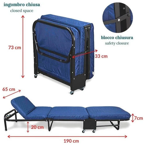 Kit Letto Singolo Pieghevole con Materasso in Waterfoam 65×190 alto 7 cm, MATERASSO Ortopedico con Rivestimento Traspirante, tessuto Anallergico e Antiacaro, Lastra interna in Water Foam ad alta resilienza, poliuretano in schiuma espansa ad acqua, per donare il giusto sostegno alla colonna vertebrale. Testata Regolabile in varie posizioni. Brandina adatto a pesi fino 130 kg – Modello EASY. Telaio portante in acciaio ad alta resistenza di nuova generazione, sagomato 40×36 e verniciato con polveri epossidiche. Rinforzata – garantisce una tenuta ancora più solida. Completa di 4 ruote avvitabili ANTIGRAFFIO alti 5 cm in nylon ad alta resistenza e viti di montaggio per il fissaggio – permettono un facile spostamento di quest’ultima su qualsiasi tipo di pavimento. Angoli antinfortunistici in nylon e fibra di vetro ad alta resistenza. Brandina con 3 Doghe Uniche Ammortizzate poste su supporti in acciaio e caratterizzata da uniformità di comportamento delle singole doghe. Le doghe in betulla di questa rete subiscono la piegatura a vapore, rendendole più elastiche, mentre la verniciatura, fatta con prodotti naturali, protegge il legno dagli agenti esterni. Inoltre sono dotate di pellicola protettiva la quale, insieme alle lavorazioni a fori e le scanalature, favoriscono la areazione. Letto Salva Spazio – Apribile – Reclinabile, ideale per Ospiti come Letto di Emergenza Estraibile, x camera, cameretta o campeggio, Compatibile con tutti i tipi di Materassi alti max 10 cm e Cuscini. Misure Ingombro Branda CHIUSA: una volta piegata è piccolissima, 73 cm in altezza // 33 cm in spessore // 65 cm in larghezza. Misure Ingombro Branda DISTESA: 65 cm Larghezza x 190 cm di Lunghezza x 20 cm Altezza Finita da terra al Bordo Superiore.