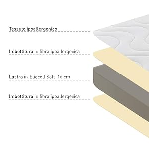 É composto da una lastra di Eliocell Soft, un materiale formato da una schiuma poliuretanica espansa ad acqua, che rende il materasso soffice ed accogliente, in grado di sostenere dolcemente ogni zona del corpo. Il rivestimento in tessuto ipoallergenico, con imbottitura in fibra ipoallergenica e traspirante, è sinonimo di igiene e rende il materasso più resistente alla formazione di batteri.