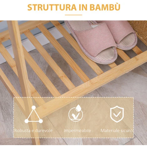 Assicurati che la casa sia sempre ordinata e organizzata con questo appendiabiti da terra HOMCOM. Sono presenti 2 ganci e 1 binario per appendere cappotti, sciarpe e borse, mentre 2 ripiani aperti servono per riporre cestini ed espositori. Inoltre, la struttura in bambù naturale rende questo mobile appendiabiti rustico un’ottima aggiunta all’ingresso, al soggiorno e alla camera da letto. Sarà un ottimo complemento per il tuo arredamento.
