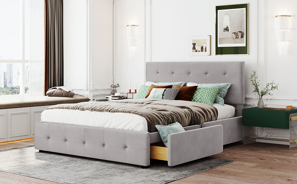 【Stile classico】Stile classico e coprimaterasso rigido, tessuto in velluto delicato sulla pelle e quattro cassetti portaoggetti, questo classico letto a piattaforma imbottito è l’ideale per adulti, bambini, adolescenti e letti per ospiti