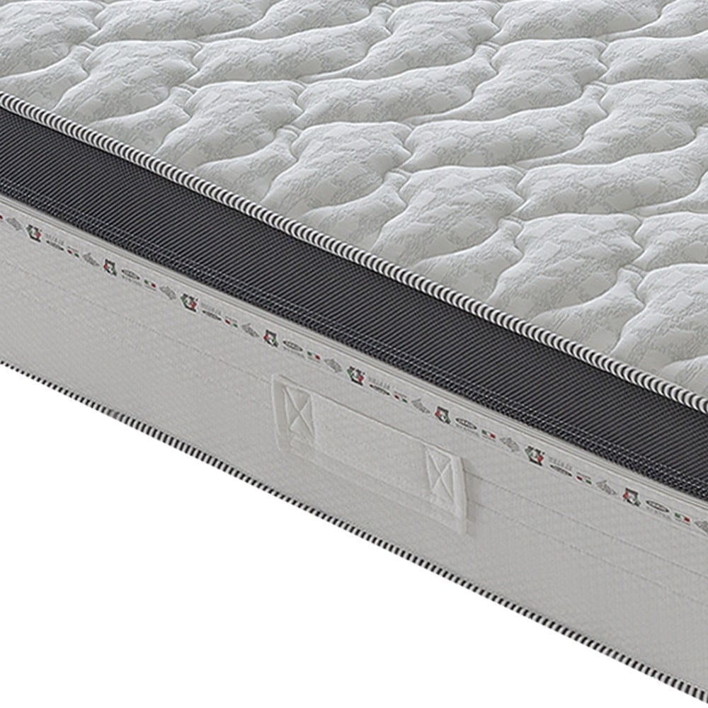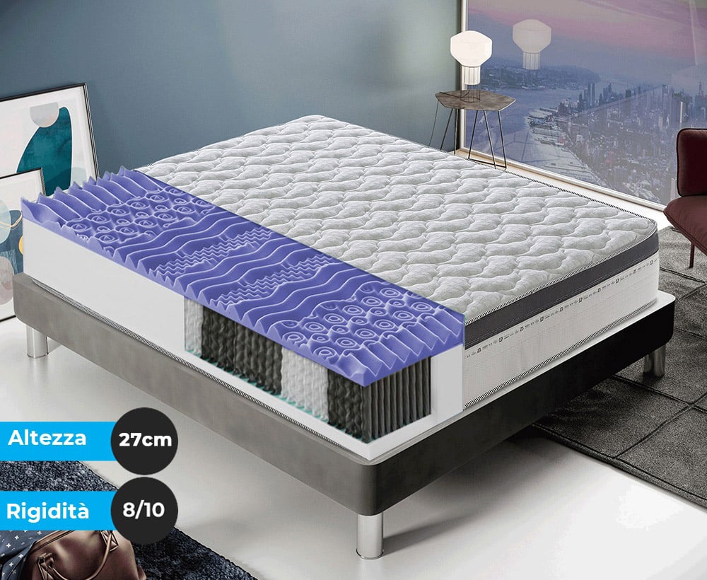 Il materasso a molle insacchettate è un prodotto nato dall’unione di molle in acciaio al carbonio fosfato, uno strato di superficie in memory foam con struttura a cellule aperte, con uno spessore di 7cm. Mentre le molle sostengono il peso del corpo, il memory foam si adatta alla sua forma, offrendo il miglior tipo di riposo possibile su un materasso di questo tipo. Lo spessore totale del materasso è di 27 cm. Le molle hanno un’altezza di 14 cm e sono racchiuse in un box di 6 cm di spessore complessivo, mentre l’imbottitura in fibra di poliuretano ipoallergenico ha uno spessore di circa 1 cm.