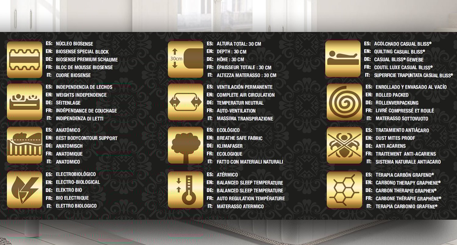 - Altezza+/- 30 cm. Speciale cuore ortopedico Bio Sense Plus. Cuore indeformabile, Gran durabilità. Anatomico. Ergomico. Silenzioso. L’unione dei differenti strati del materasso di alta e bassa resilienza e il sistema a strati assicurano un effetto simile alla assenza di gravitá. Gradi Rigiditá H2-H3.