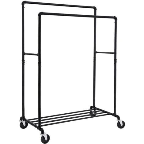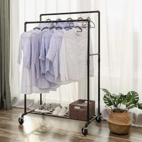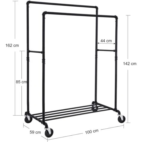 Design con Tubo dell’AcquaI gomiti su entrambe le estremità della barra appendiabiti evitano che le grucce cadano, il design del tubo dell’acqua vintage si adatta all’uso domestico e commerciale. | Più Spazio per AppendereLa distanza tra le traverse di 44 cm lascia spazio sufficiente per appendere due file di vestiti. | Ripiano Robusto e DurevoleRealizzato da 4 barre metalliche, regge fino a 15 kg, è possibile riporre scarpe, borse, scatole, ecc. |