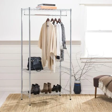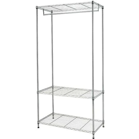 Dotato di solida struttura in acciaio inox con finitura cromata più stabile solida e resistente, ottima capacità di carico con asta appendi grucce e doppio ripiano d’appoggio inferiore.