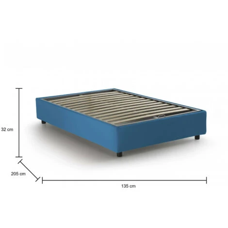 MISURE E APERTURA – Dimensioni letto: Lunghezza 205 x Larghezza 135 x Altezza 32 cm (altezza rete da terra: 32cm) – Apertura contenitore: frontale – Profondità contenitore: 20 cm circa – Altezza dei piedi: 10 cm circa – Fondo del letto in nobilitato con spessore di 1 cm – Adatto per materasso di dimensione: 120×190 cm – Materasso non incluso