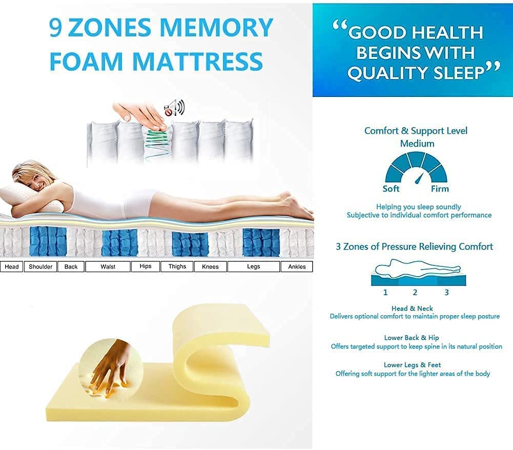 【Materasso a molle insacchettate individuali】 — Con un innovativo sistema di supporto a 9 zone costruito da singole tasche a molle, buon assorbimento degli urti e resilienza, soddisfa bene le tue vertebre, aiuta a regolare e correggere la tua postura del sonno e a rilassare completamente i tuoi muscoli, migliorando notevolmente la qualità del tuo sonno.