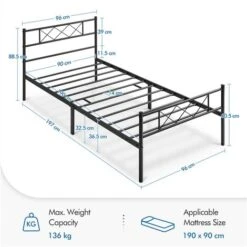 ✔️ Robusta struttura: questa robusta struttura per letto singolo è realizzata con una solida struttura in metallo e presenta un peso netto di 14,4 kg. È in grado di sostenere fino a 136 kg. La base del letto presenta inoltre piedini antiscivolo in plastica per una maggiore protezione del pavimento. Tutti questi elementi ottimizzano la sicurezza del prodotto e l’esperienza dell’utente.